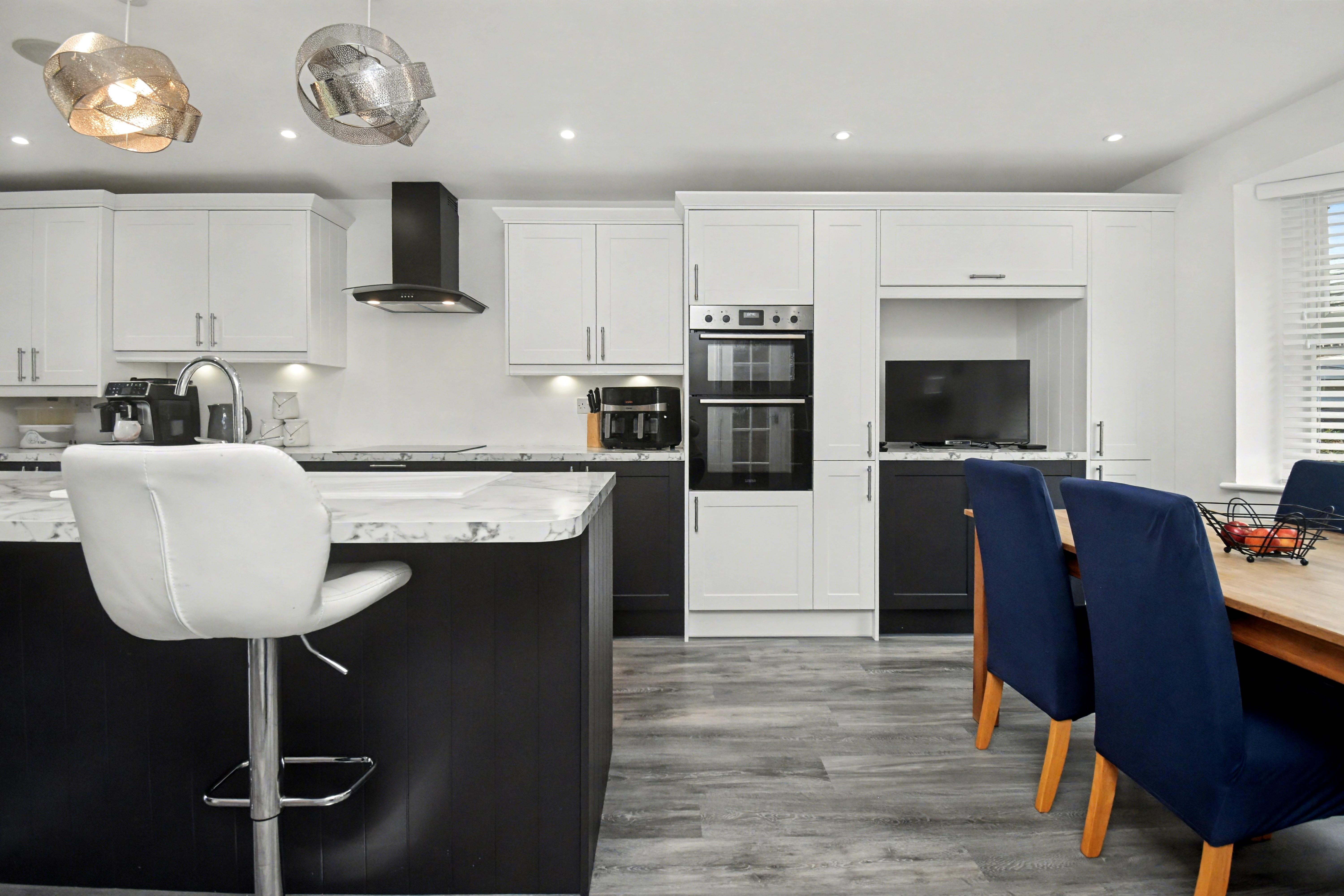 Upon entering, you are greeted by a spacious and welcoming entrance hall that sets the tone for the rest of the home. The ground floor features a cloakroom/WC, a generously sized sitting room with French doors opening onto the garden, and a versatile study/playroom perfect for remote work or family use. The true heart of the home is the stunning open-plan kitchen, dining, and family area, showcasing a recently refitted Wren kitchen complete with integrated appliances and a sleek central island, creating the perfect space for entertaining and everyday living alike.
